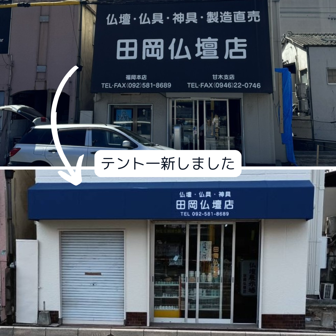 仏壇・仏具の販売と修理をされている田岡仏壇店様のテント交換をご依頼いただきました。場所は博多区寿町3丁目でJR南福岡駅の方です🕯️🌿