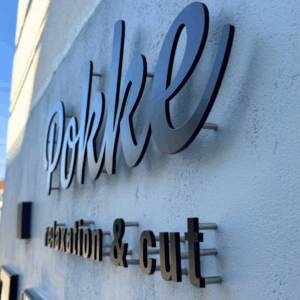 今回、ご採用いただいたのは、ステンレス切文字サイン。スタイリッシュで洗練された印象を与え、おしゃれに店舗名を見せたいときに最適です。 特にPokke様のように壁面から浮かせた切文字は、光の当たり方で壁に陰影を作り出し、奥行きと立体感がアップ。壁面全体を表情豊かに見せてくれます🎨お店の「顔」となる大切な店名サインは、ぜひ当社へお任せください!